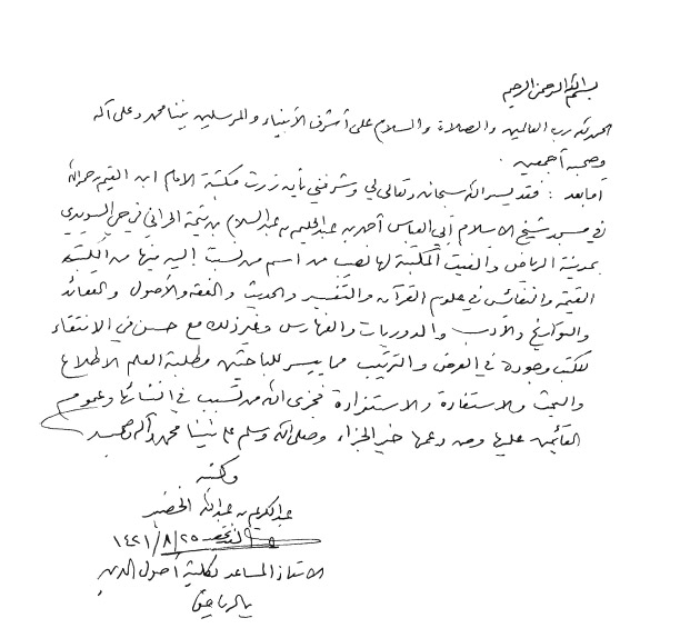 فقد يسر الله -سبحانه وتعالى- لي وشرفني بأن زرت مكتبة الإمام ابن القيم -رحمه الله- في مسجد شيخ الإسلام أبي العباس أحمد بن عبد الحليم بن عبد السلام بن تيمية الحراني في حي السويدي بمدينة الرياض وألفَيْتُ المكتبة لها نصيب من اسم من نُسبت إليه. فيها من الكتب القيمة والنفائس في علوم القرآن والتفسير، والحديث والفقه، والأصول والعقائد، والتواريخ والأدب، والدوريات والفهارس، وغير ذلك مع حُسن في الانتقاء للكتب، وجودة في العرض والترتيب، مما يُيَسِّرُ للباحثين وطلبة العلم الاطلاع والبحث والاستفادة والاستزادة، فجزى الله من تسبب في إنشائها، وعموم القائمين عليها، ومن دعمها خير الجزاء، وصلى الله وسلم على نبينا محمد وآله وصحبه.