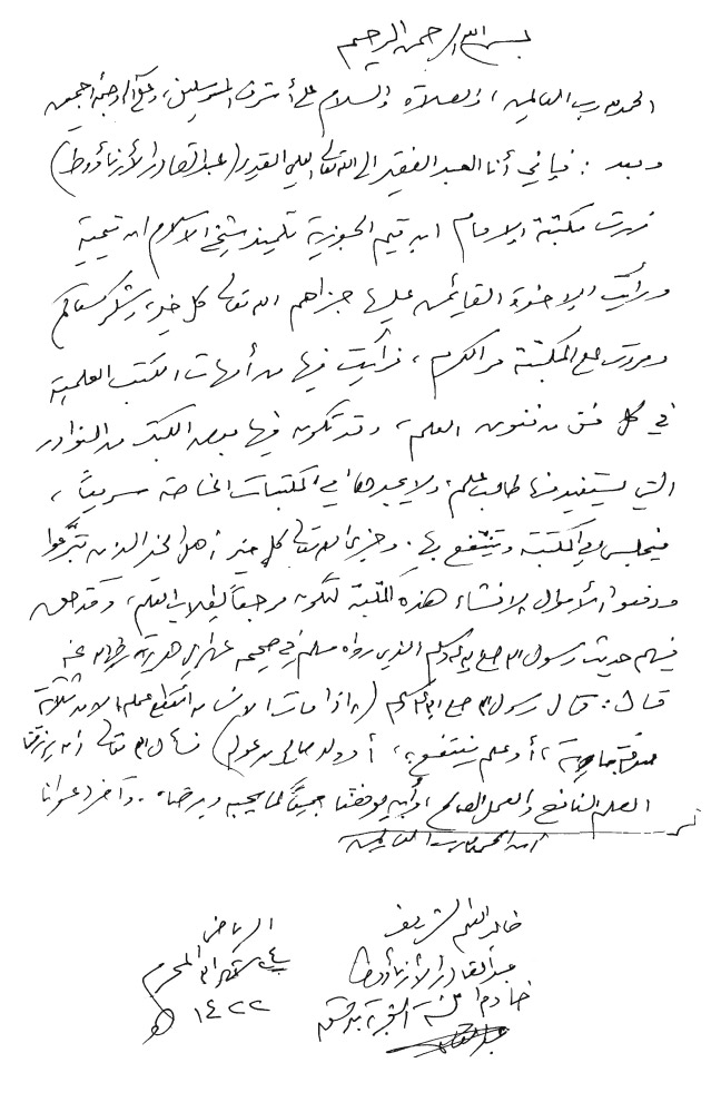 فإني أنا العبد الفقير إلى الله -تعالى- العلي القدير (عبد القادر الأرناؤوط) زرت مكتبة الإمام ابن قيم الجوزية تلميذ شيخ الإسلام ابن تيمية، ورأيت الإخوة القائمين عليها جزاهم الله -تعالى- كل خير، وشَكَرَ مَسْعَاهم. ومررت على المكتبة مَرَّ الكِرَام، فرأيت فيها من أمهات الكتب العلمية في كل فن من فنون العلم، وقد تكون فيها بعض الكتب من النوادر التي يَستفيد منها طالب العلم ولا يجدها في المكتبات الخاصة سريعا، فيجلس في المكتبة ينتفع بها. وجزى الله كل خير أهل الخير الذين تبرعوا ودفعوا الأموال لإنشاء هذه المكتبة؛ لتكون مرجعا لطلاب العلم، وقد حق فيهم حديث رسول الله -صلى الله عليه وسلم- الذي رواه مسلم في صحيحه عن أبي هريرة -رضي الله عنه- قال: قال رسول الله -صلى الله عليه وسلم-: «إذا مات ابن آدم؛ انقطع عمله إلا من ثلاث: صدقة جارية، أو علم ينتفع به، أو ولد صالح يدعو له».